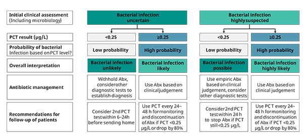 - lze použít k podpoře vysazení empirické antibiotické léčby u pacientů, u kterých se původně zdálo, že mají sepsi, ale následně se u nich vyskytují omezené klinické důkazy o infekci