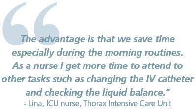 With this set-up each nurse can save at least 5-10 minutes every morning: "The advantage is that we save time especially during the morning routines. As a nurse I get more time to attend to other tasks such as changing the IV catheter and checking the liquid balance."